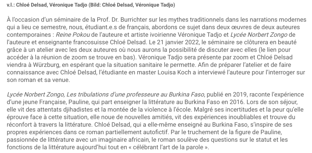 Conférence/ Workshop à l’Université de Würzburg, le 21 janvier 2022.