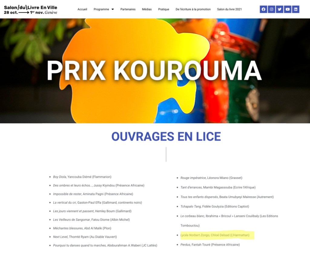 Lycée Norbert Zongo en lice pour le Prix Kourouma au Salon du livre de Genève, octobre 2020.